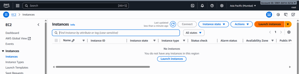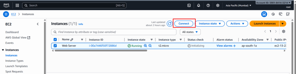 Once running, go to Instances → Select Instance → Connect.