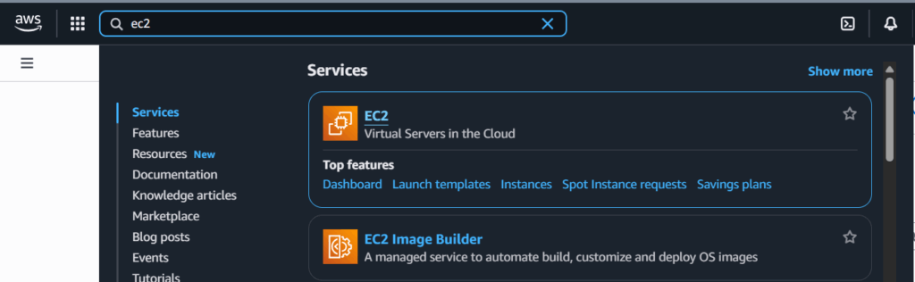 Search for EC2 in the search bar and open it.